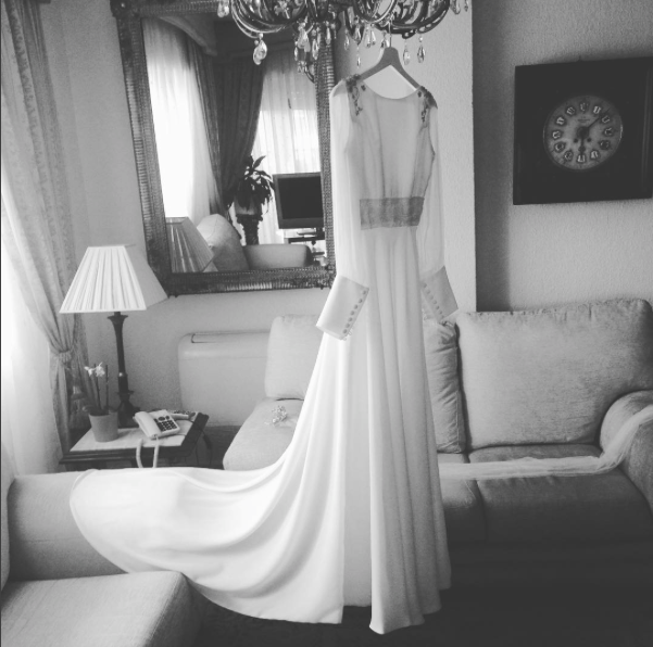 "A las 7:00am me levanté como un resorte, desayuné, me vestí y me puse mi anillo preferido ;) cogí mi kit de costura y lo más importante que llevaba custodiando ya unos días: el vestido de la novia.